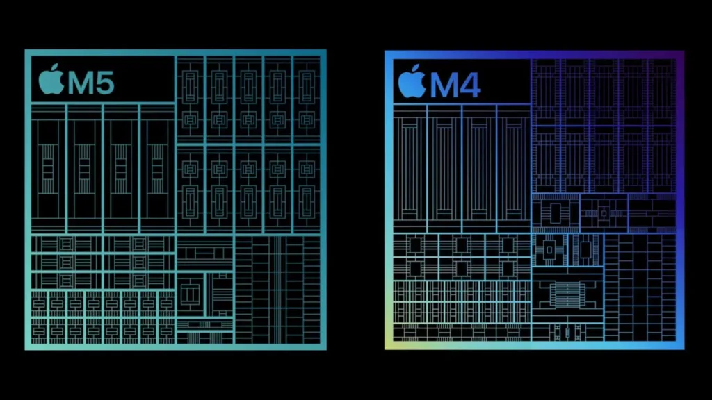 - معماری کلی: هر دو 9 یا 10 هسته CPU، 10 هسته GPU، 16 هسته Neural Engine؛ اما هستهها در M5 ارتقا یافتهاند.