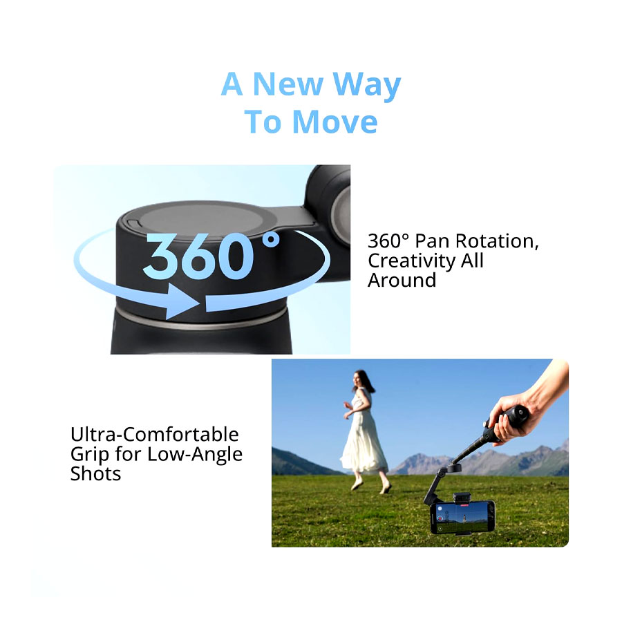 طراحی ارگونومیک دسته گیمبال، به کاربر اجازه میدهد تا آن را به صورت وارونه نگه دارد (Inverted Mode) و با حفظ ثبات کامل، دوربین را به سطح زمین نزدیک کند. این زاویهها برای ثبت دید کودکان، حیوانات یا ایجاد حس عمق در مناظر عالی هستند.